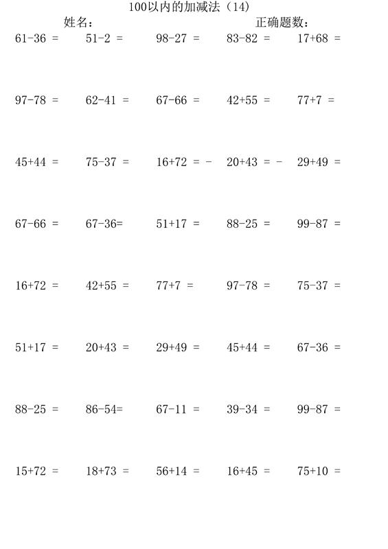 小学一年级数学下册:《100以内的加减法》竖式计算600道!