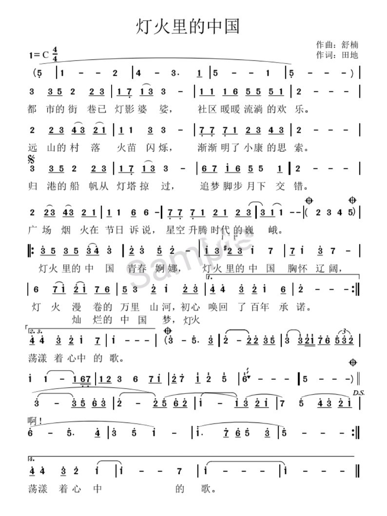 歌曲灯火里的中国的简谱歌谱下载