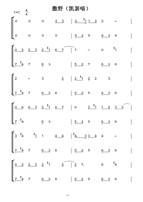 撒野(凯瑟喵)转c调 原声完整版 钢琴双手简谱 钢琴谱 钢琴简谱
