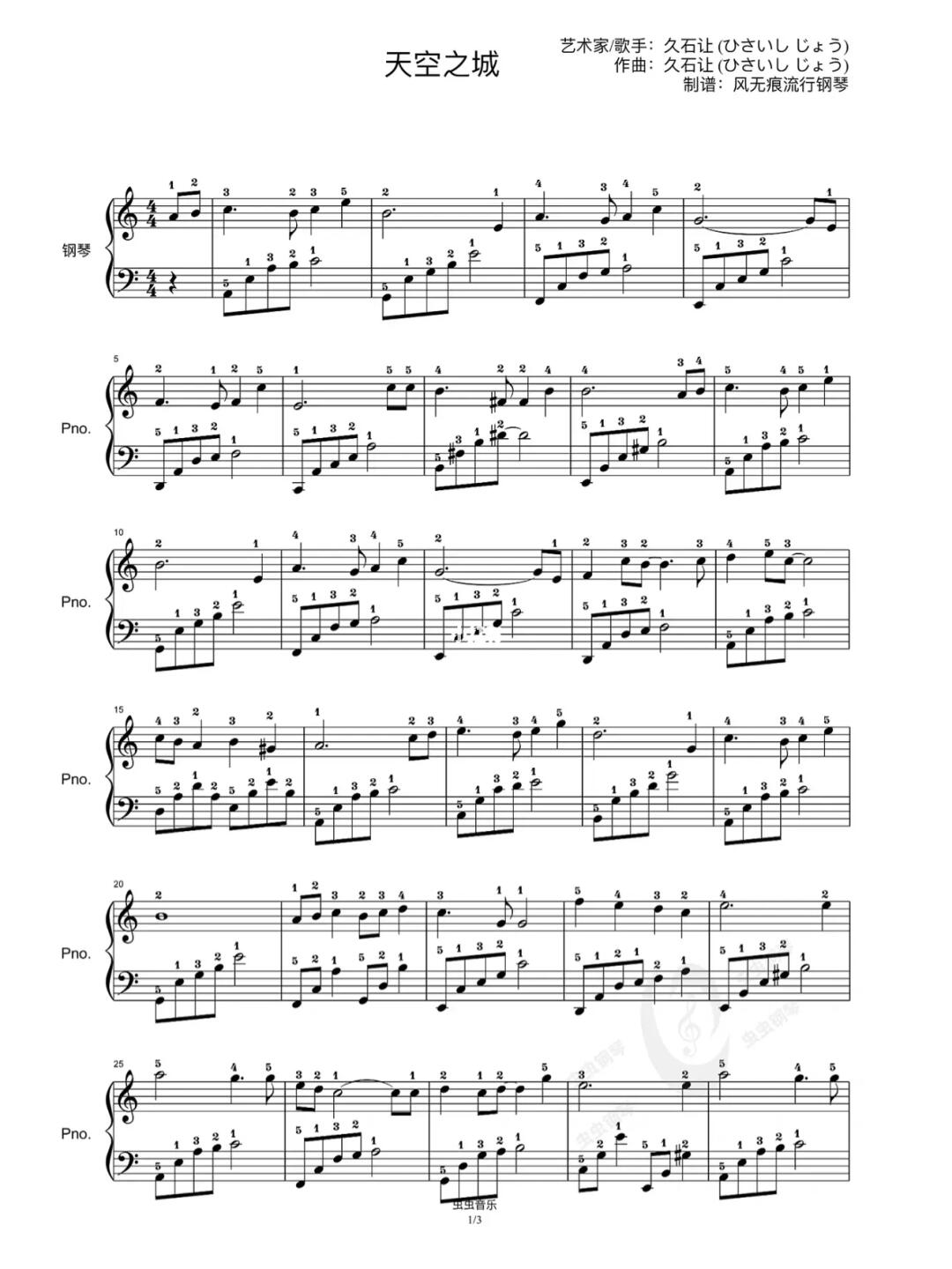 久石让天空之城c大调钢琴谱独奏带指法简单易学