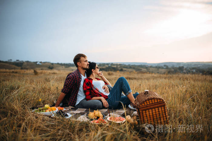 爱情侣在夏日的格子上野餐男女浪漫的野餐