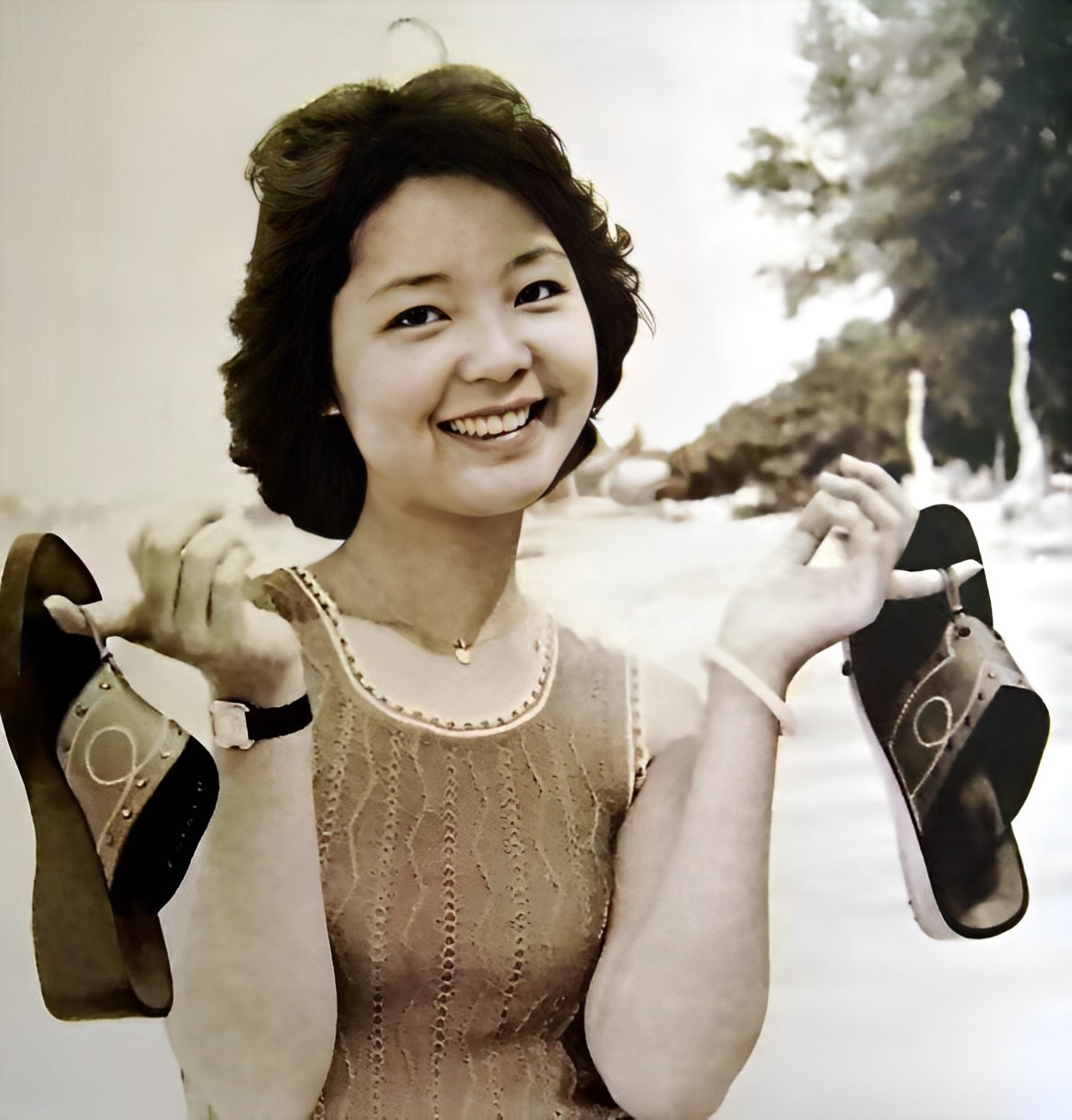 这是年轻时候的邓丽君在沙滩边的留影.