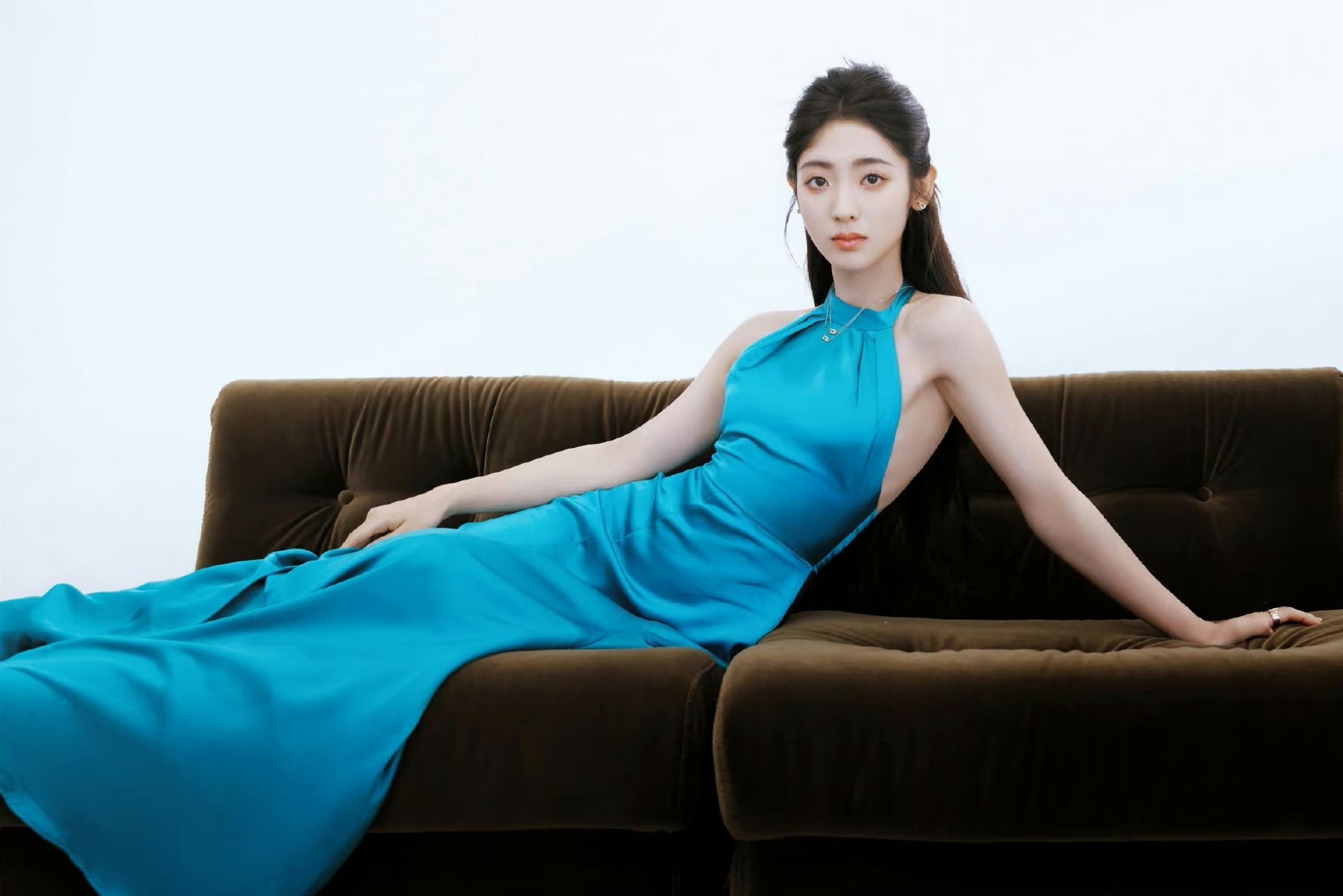 邢菲# 一袭蓝色挂脖露背纱裙,甜美清纯的容颜,白皙水嫩的肌肤,窈窕