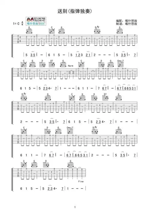 送别(g调指弹独奏) 吉他谱 - 第1张