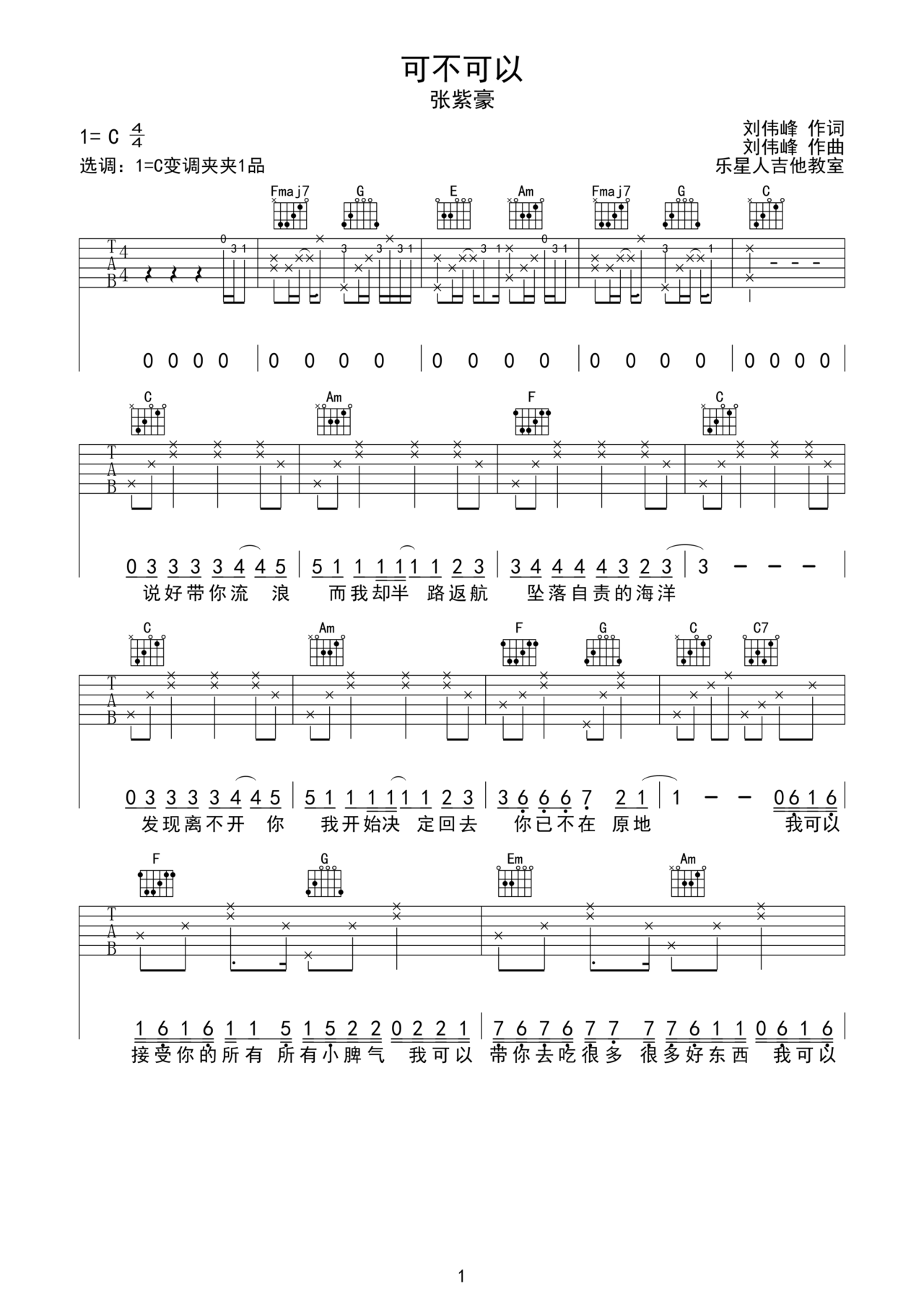 可不可以简谱(歌词)_张紫豪演唱_蒹葭采采制谱