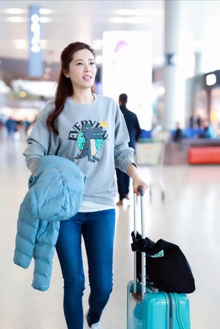 原创43岁曾黎尽显气质牛仔裤搭配浅灰色卫衣少女感十足