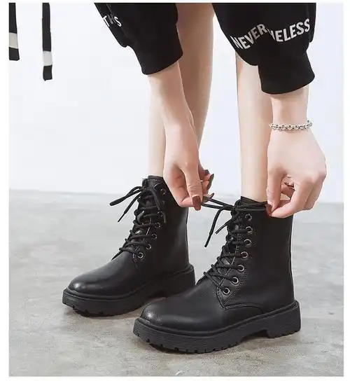 小个子靴子女中筒靴细跟女靴皱褶头层牛皮黑色真皮马丁靴短靴秋冬
