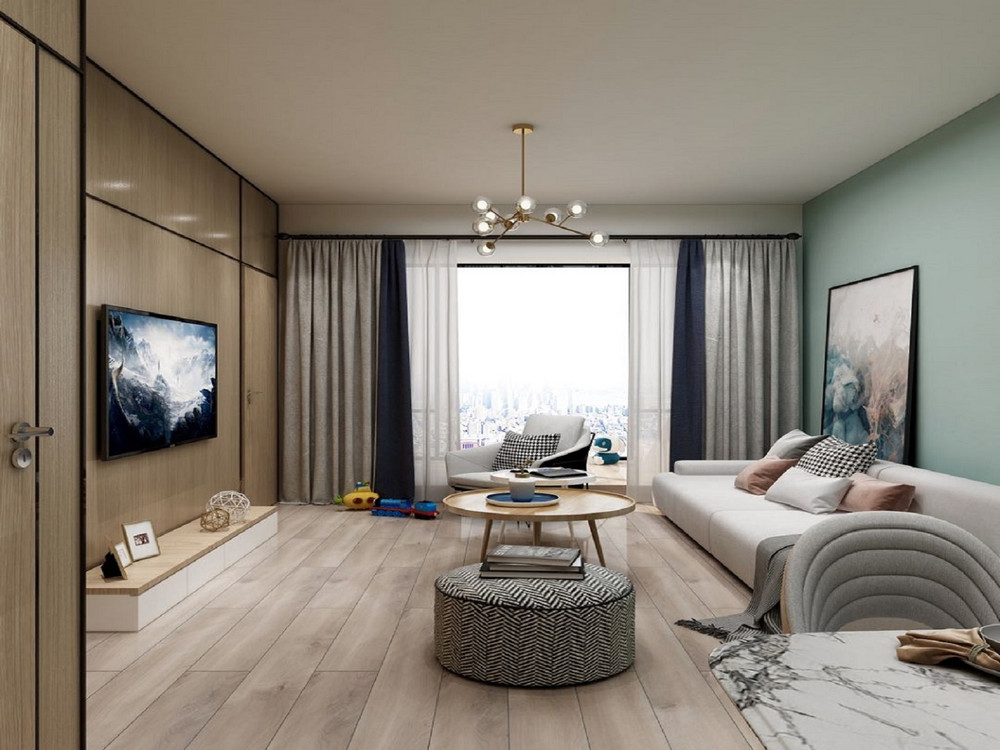 80平米现代简约风三室客厅装修效果图,背景墙创意设计图