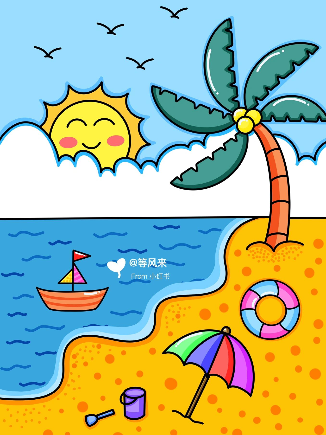 儿童画 原创主题画《夏日沙滩9215》6 人物偏小 云朵换色 铁子们
