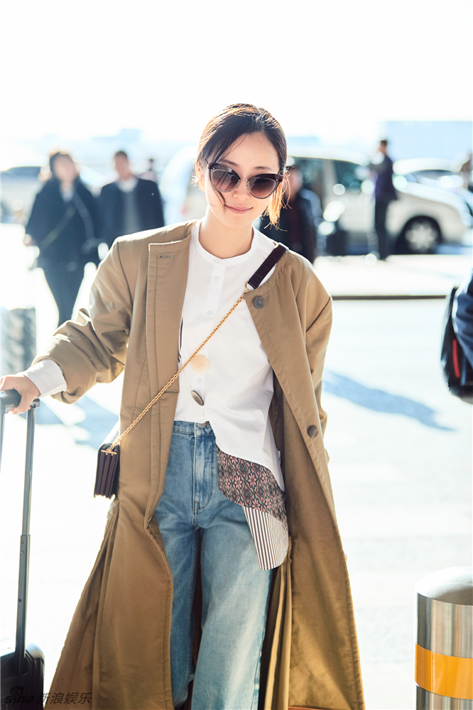 原创江一燕换风格失败,穿牛仔蓝的套装走机场,太普通像素人