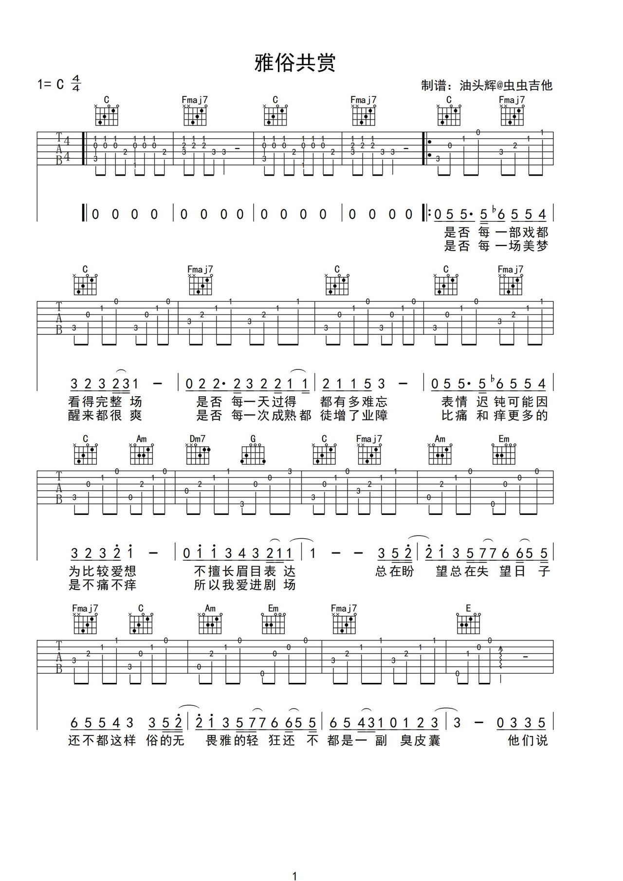 雅俗共赏吉他谱-弹唱谱-c调-虫虫吉他
