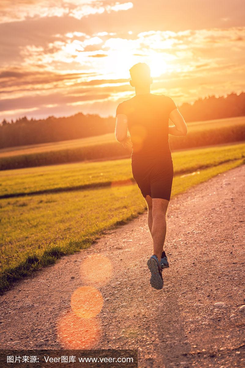 朝着日落奔跑的人的背影