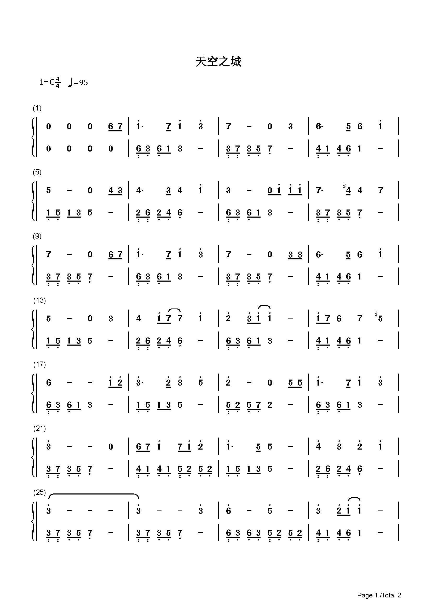 天空之城c调完美简单版双手简谱预览1