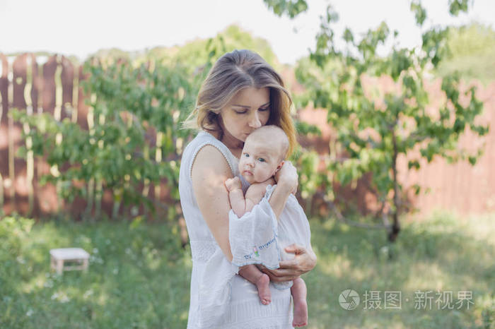 一个美丽的年轻母亲抱着一个婴儿在她的怀里站在花园里