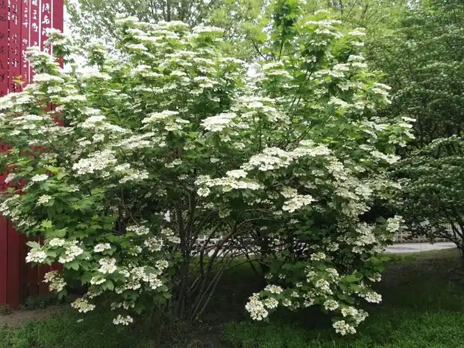 天目琼花清秀美丽花开似雪果赤如丹白色伞状花序春可观花秋可观果花语