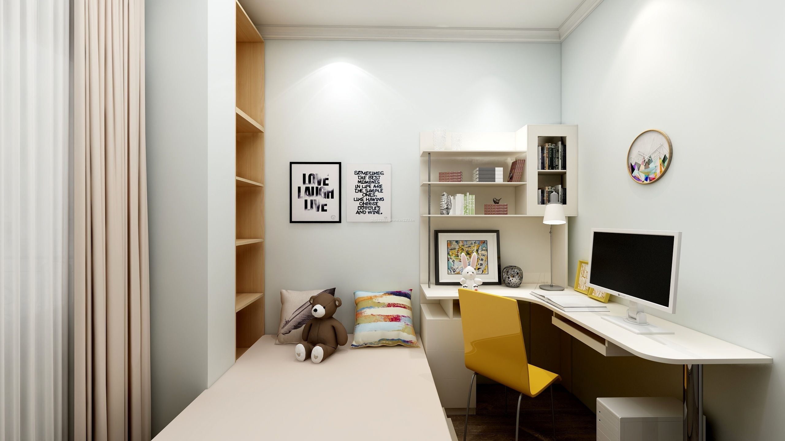 现代中式卧室转角书桌带书柜设计效果图