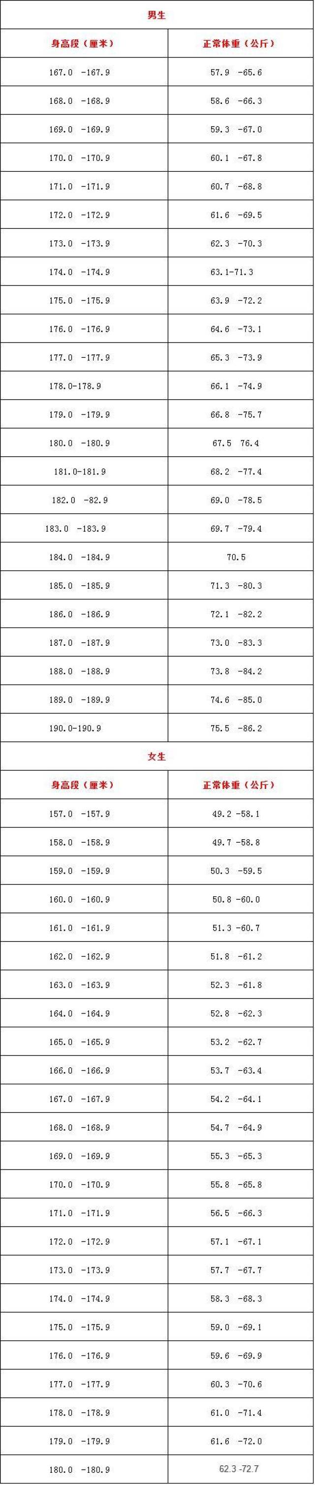身高体重标准对照表