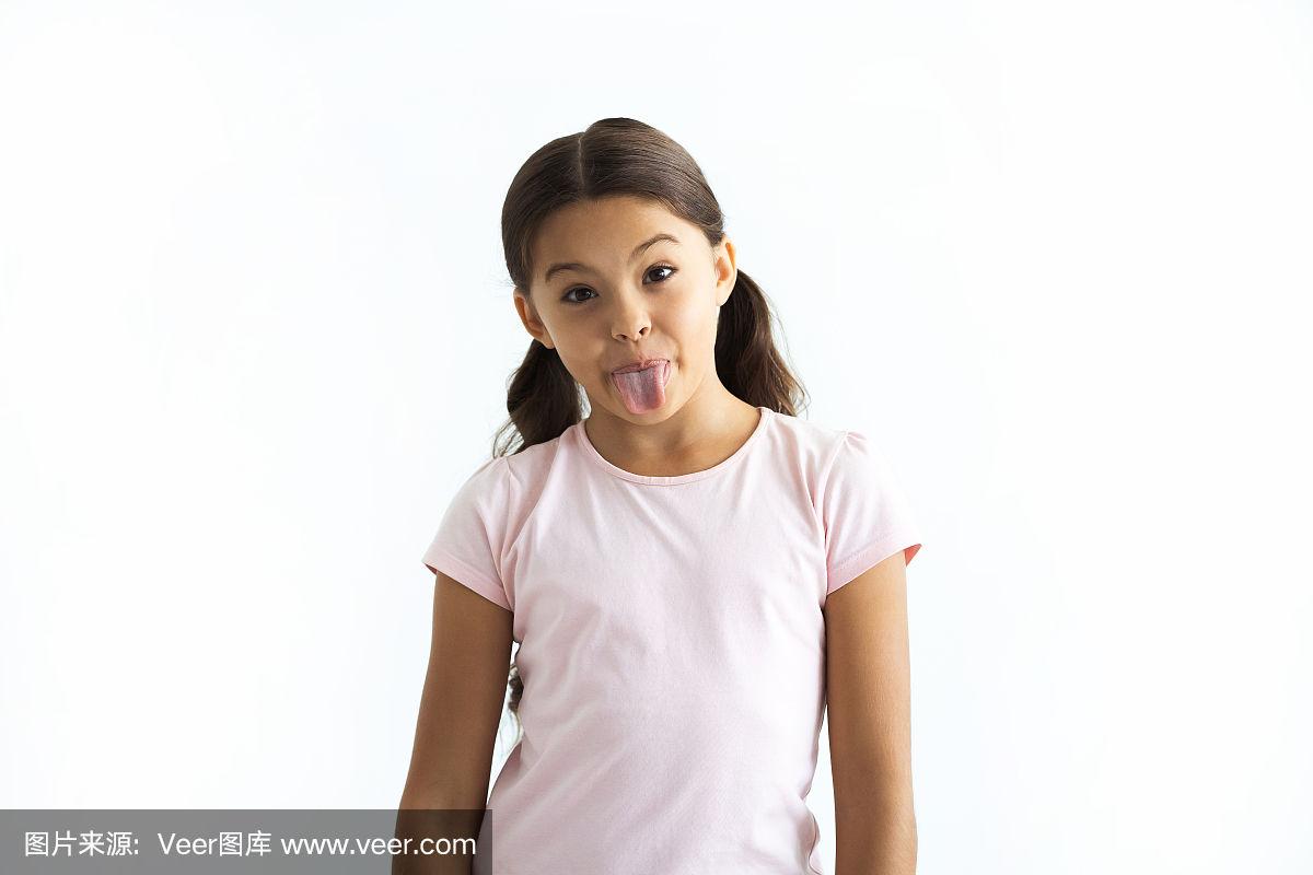 女孩微笑着张开嘴,露出长长的大舌头,孤立在白色的背景上,疯狂而吸引