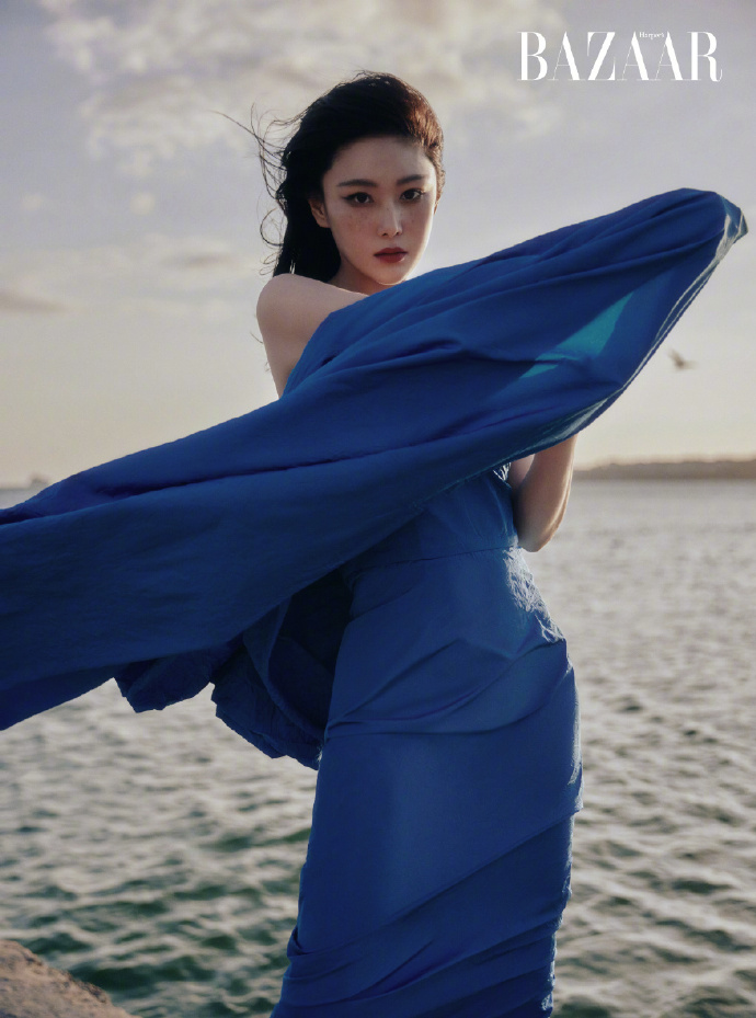 张馨予超话钻石头饰造型登保加利亚芭莎杂志封面,在海边尽显性感随性