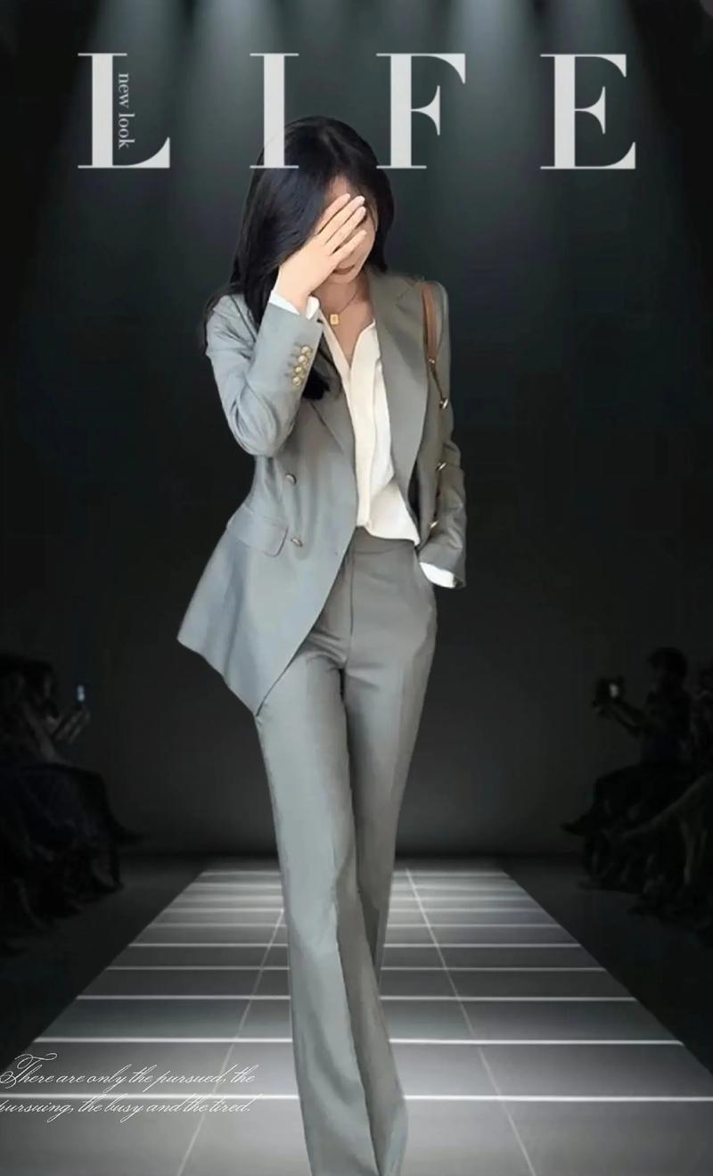 霸气的灰色西装套装~是女性兼顾着理念与性感时髦~简约时尚的翻领设