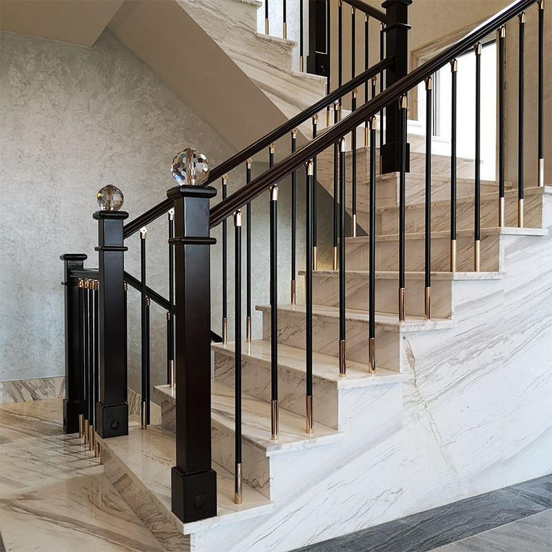 铝艺楼梯栏杆护栏栏杆美式大柱镀金成都厂家包安装红橡扶手踏步板