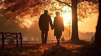 老人养老夕阳下,一位老年伙伴走在户外公园草地上的背影