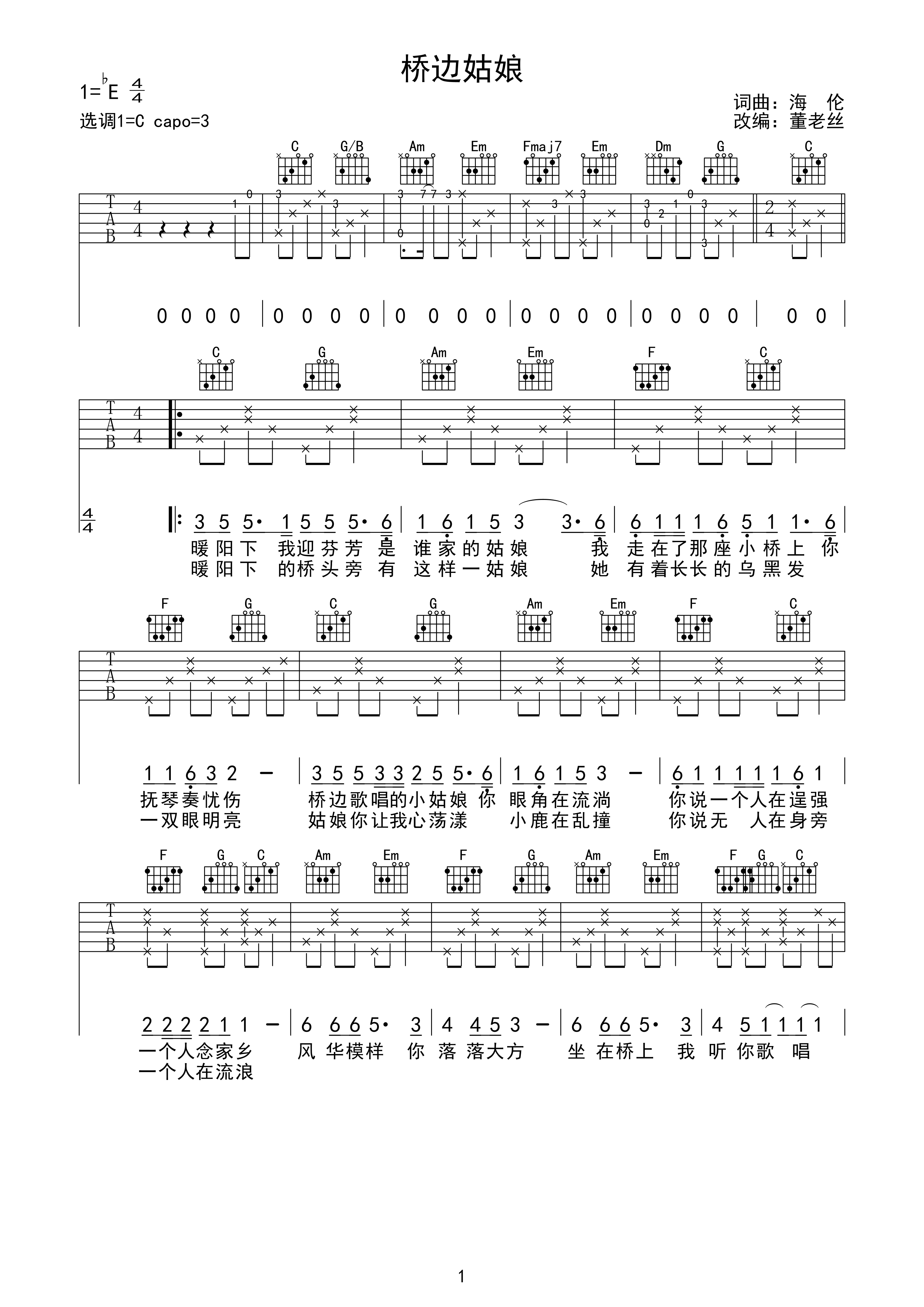 桥边姑娘 - 完美版c调六线吉他谱-虫虫吉他谱免费下载