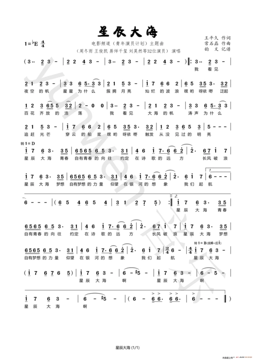星辰大海 电影频道青年演员计划主题曲 歌谱 简谱