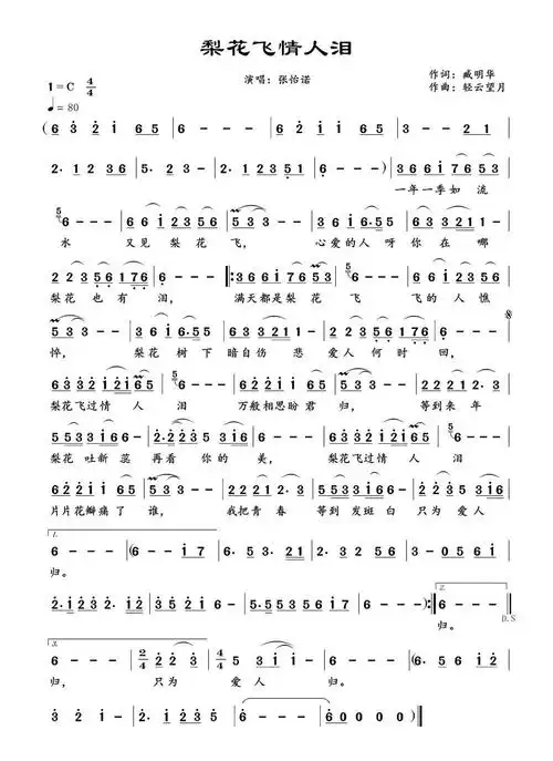 简谱歌曲《梨花飞情人泪》,歌谱,歌词逐句领唱,简单易学