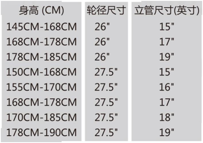 (图片取自美利达官方)右面是美利达的身高和车架尺寸对照表:方法二