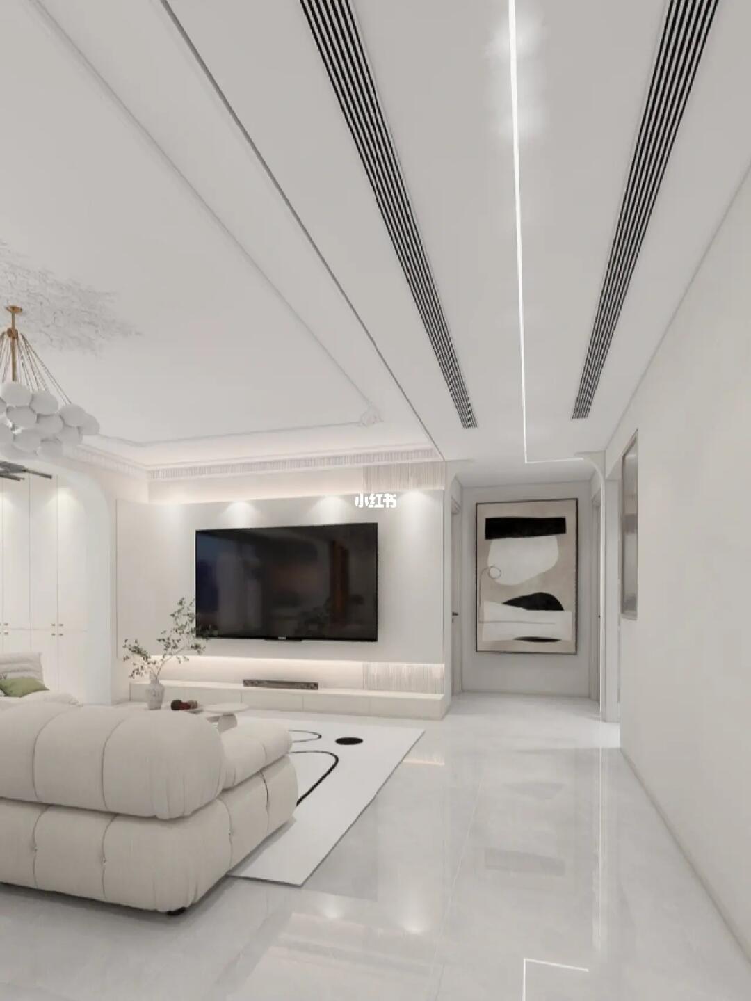 客厅电视墙分别为收纳柜,展示柜,电视墙,护墙板收边,厚度层层递减.