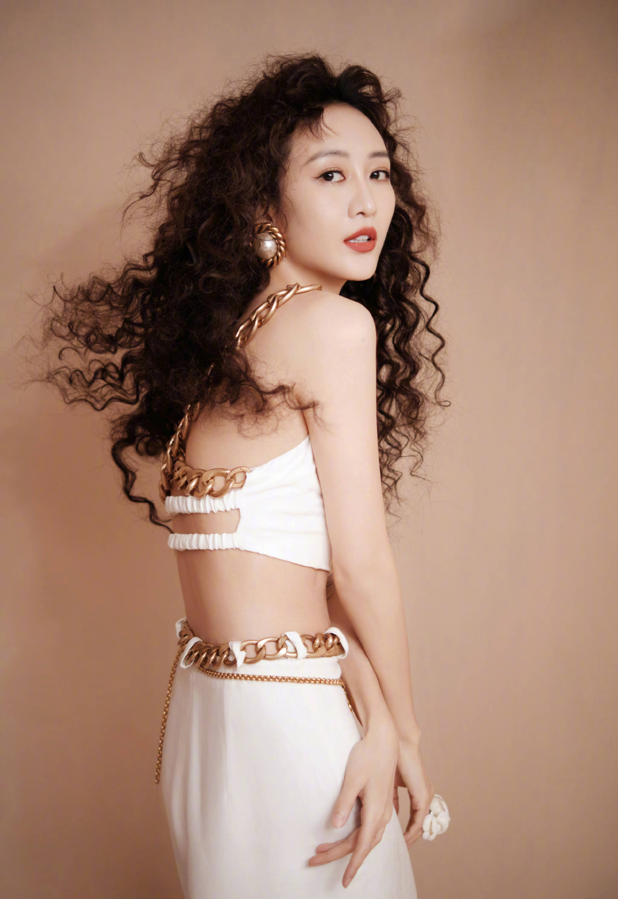 王鸥穿露背性感白衣白裙羊毛卷配红唇美艳动人
