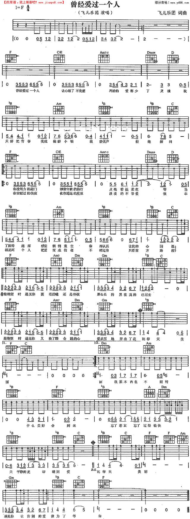 曾经爱过一个人 歌谱,吉他谱 和弦谱,简谱,五线谱