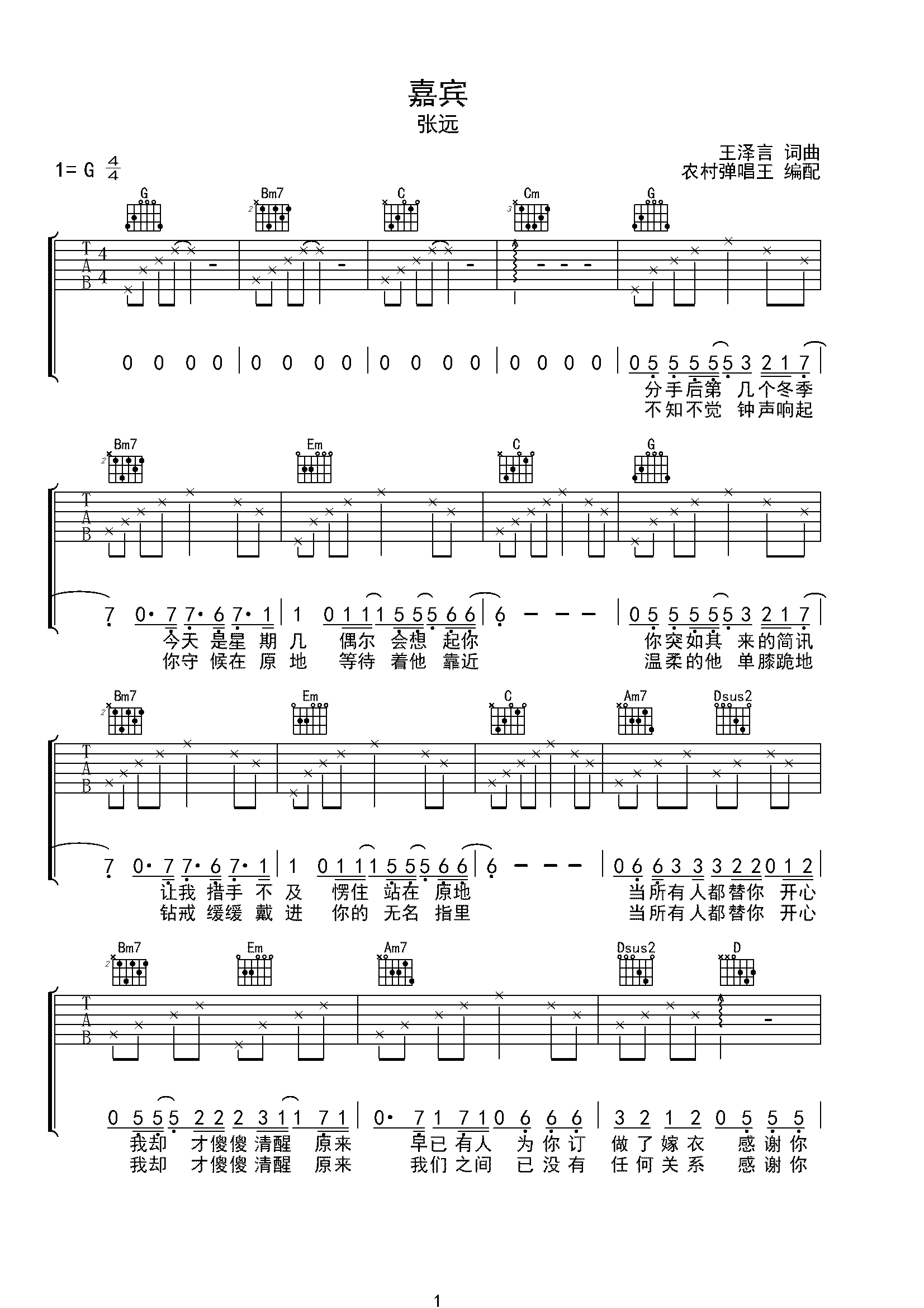 张远嘉宾原版弹唱吉他谱