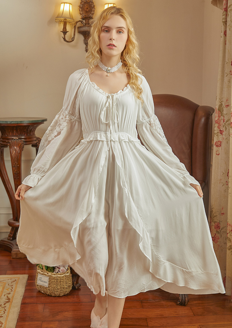 欧美宫廷复古长袖公主睡裙白色纯棉睡衣女大码宽松家居服花边特价