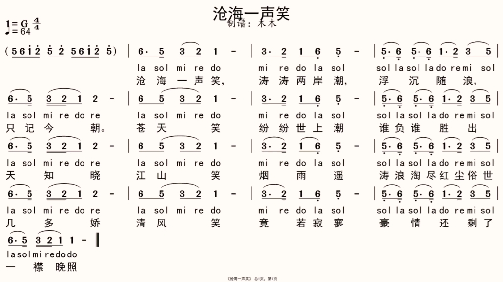 沧海一声笑简谱视唱第1页