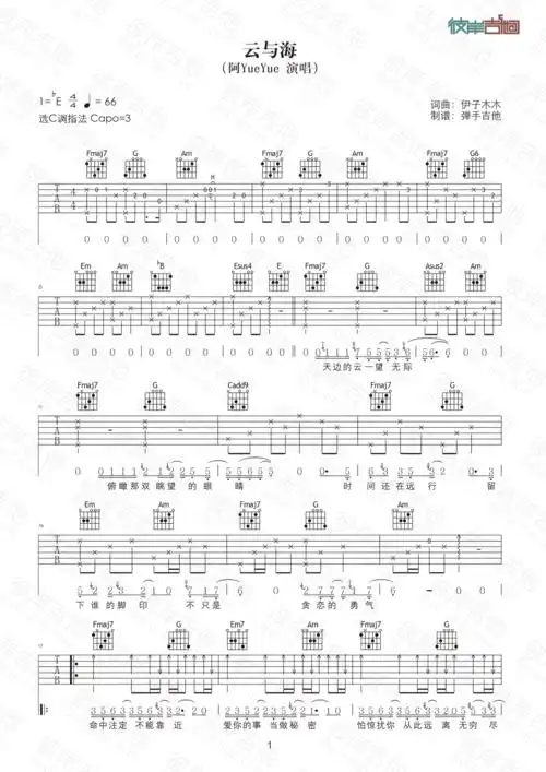 云与海吉他谱阿yueyuec调带前奏弹唱谱图片谱