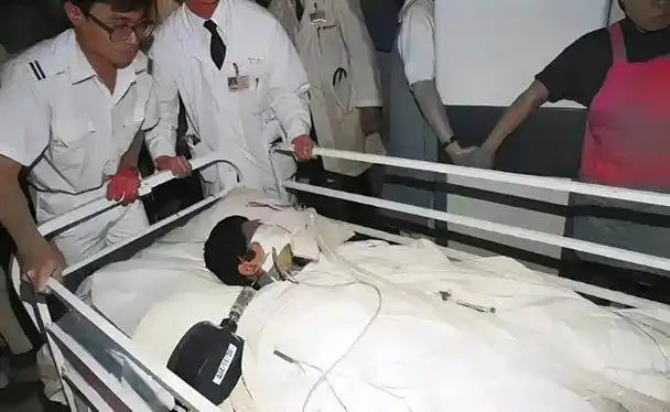 1992年,陈百强被紧急抢救时画面,全身插满管子,一年后