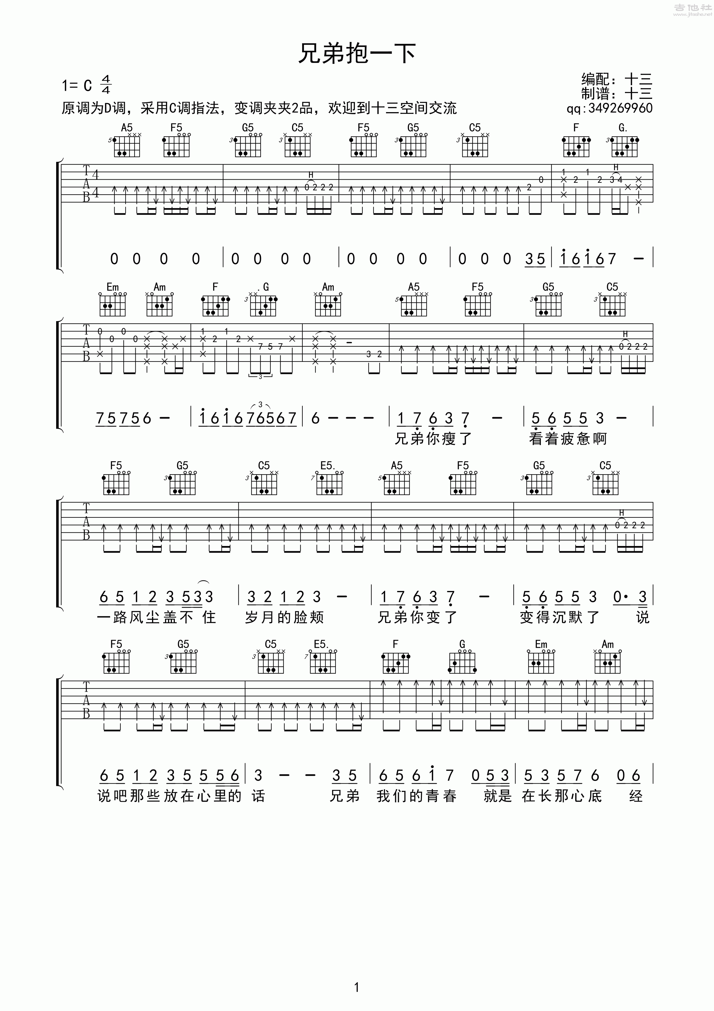 兄弟抱一下吉他谱(图片谱,弹唱)_庞龙_兄弟抱一下高清版001.gif