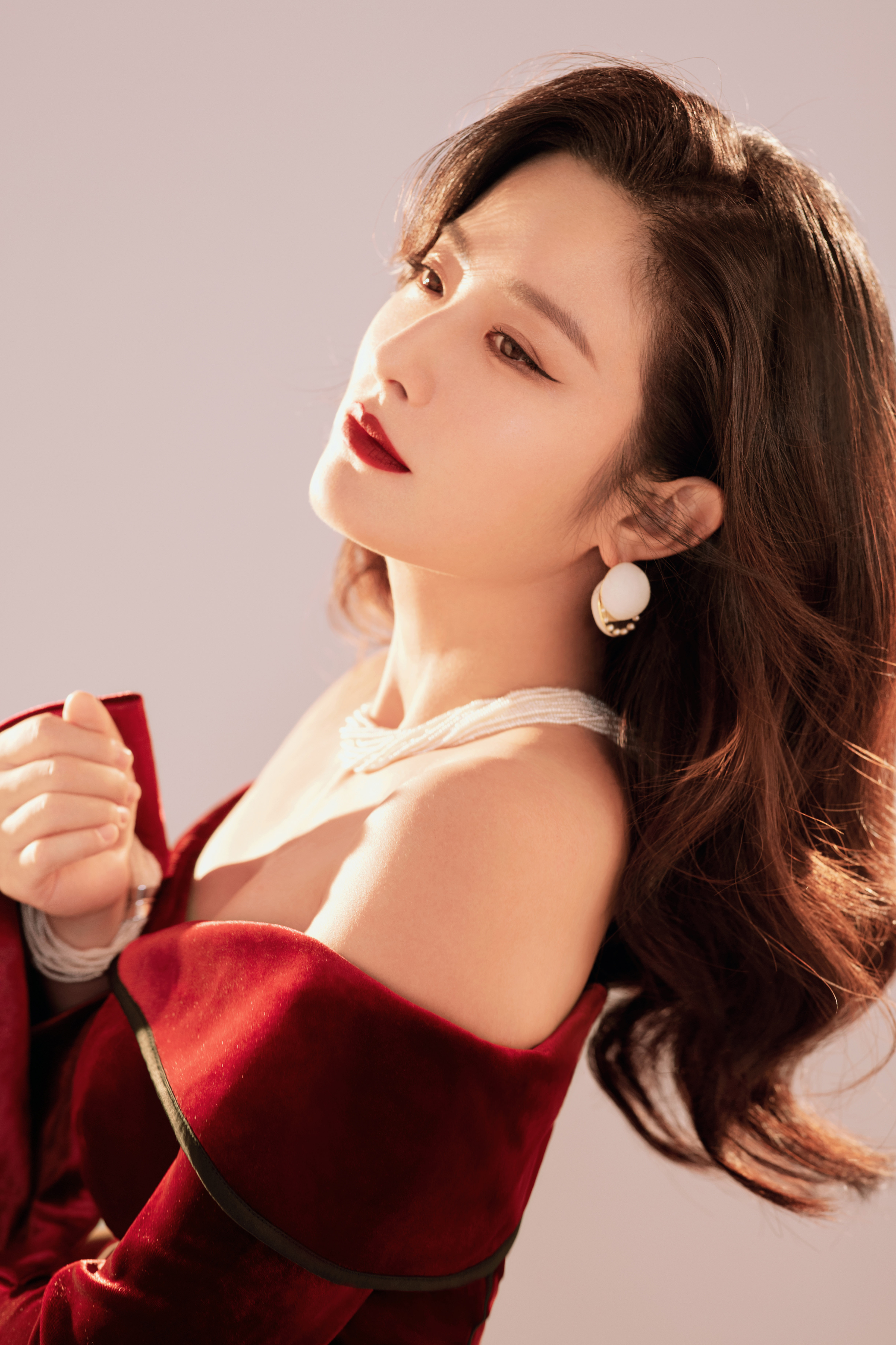 身着红色复古天鹅绒连衣裙的徐百慧,大方秀出精致锁骨