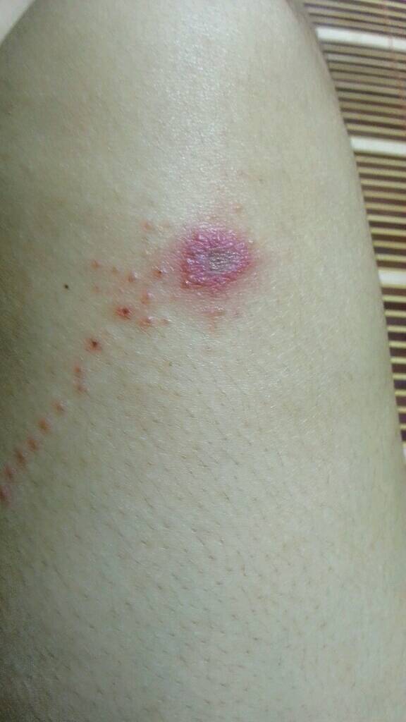求问这个会不会是恙虫伤口,周围有一串的红疹之类的