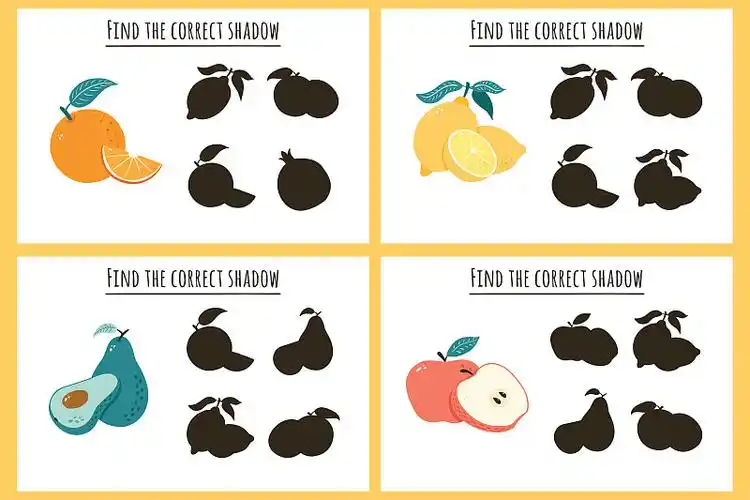 找到适合孩子的水果影子教育游戏.儿童影子匹配活动.教育工作表.