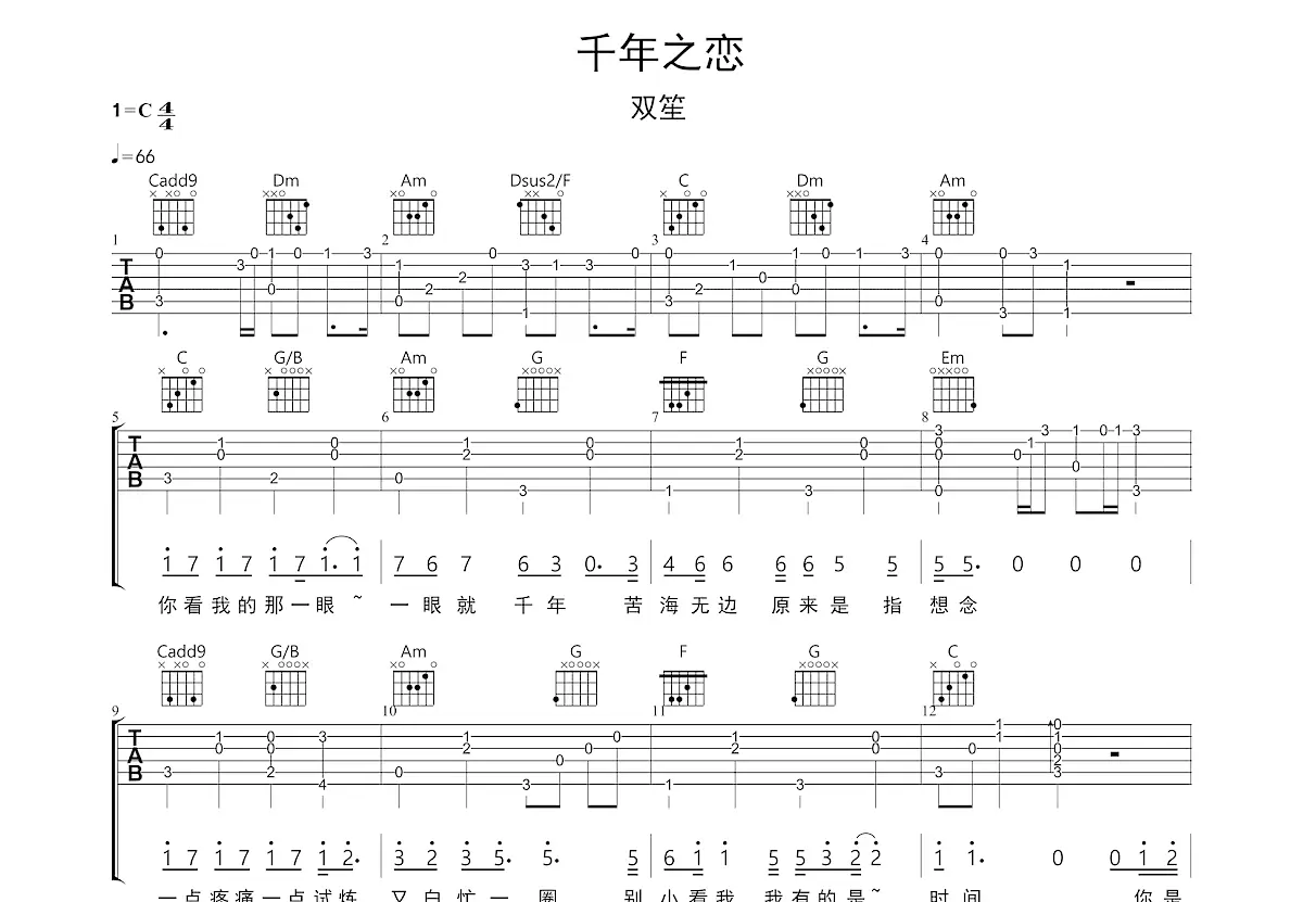 千年之恋吉他谱_双笙_c调弹唱48%原版 - 吉他世界