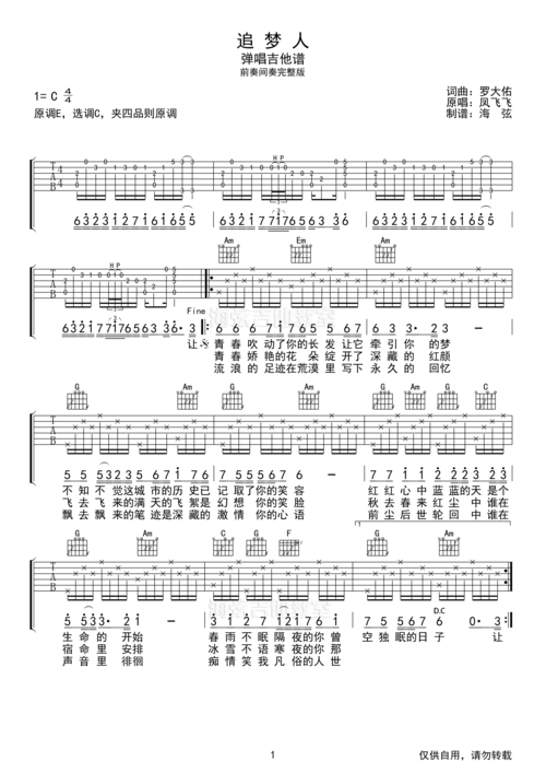 罗大佑追梦人c调带前奏间奏吉他谱