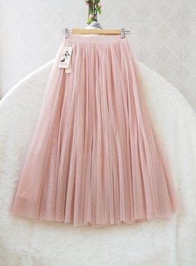 2019新品细网纱裙半身裙冬中长裙蓬蓬裙仙女大摆裙裸粉色显瘦纱裙