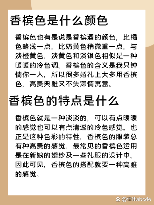香槟色最佳搭配色系 1,香槟色搭配黑色或白色 香槟色比橘色浅一些,比