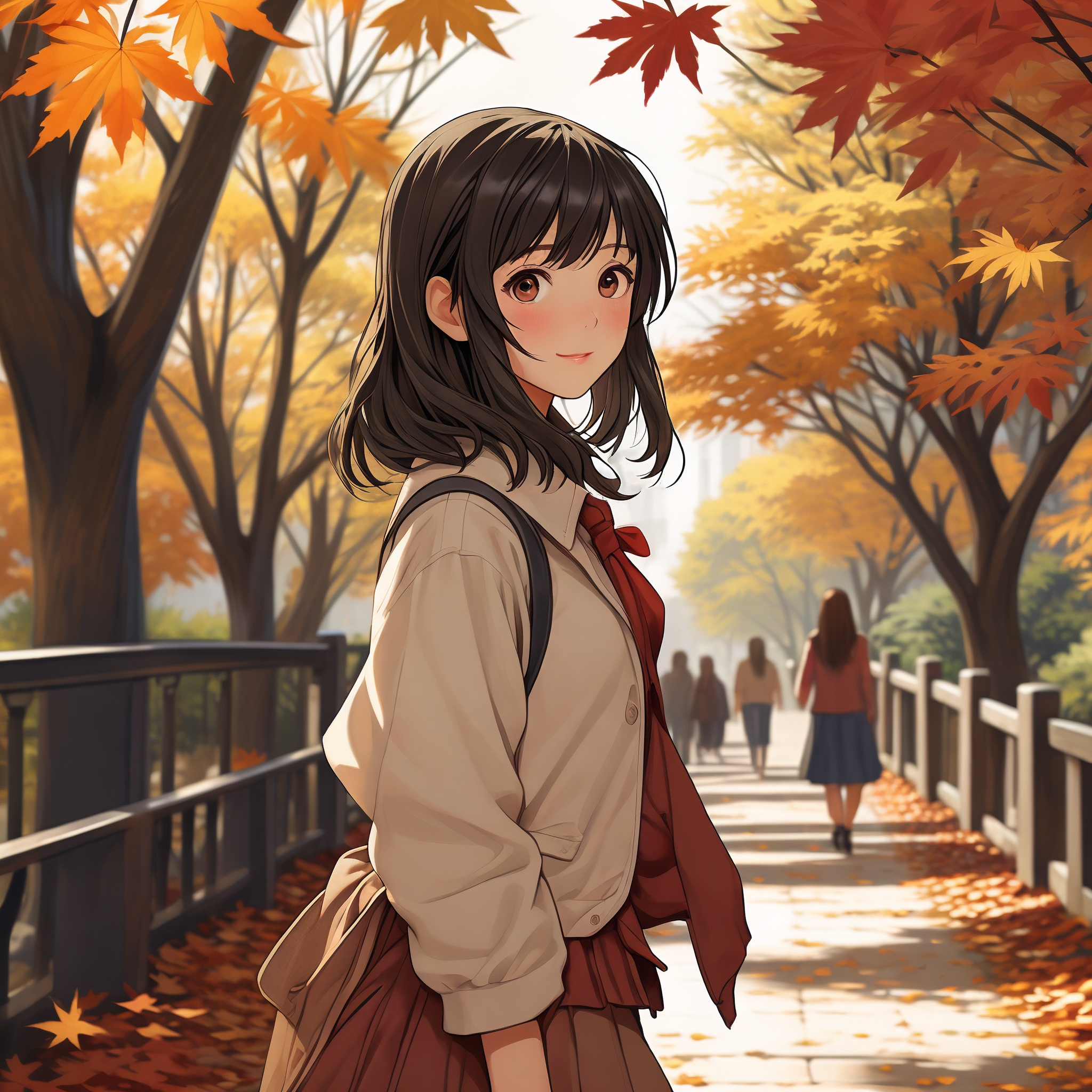 秋日校园中,小女孩沐浴在温柔暖阳下, 金色落叶翩翩而落,宛如时光匆匆