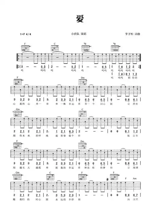 爱吉他谱 f调六线谱_扫弦版_小虎队-看谱啦