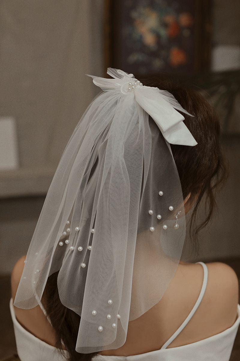 头纱新娘结婚主婚婚纱短款珍珠蝴蝶结登记领证头纱