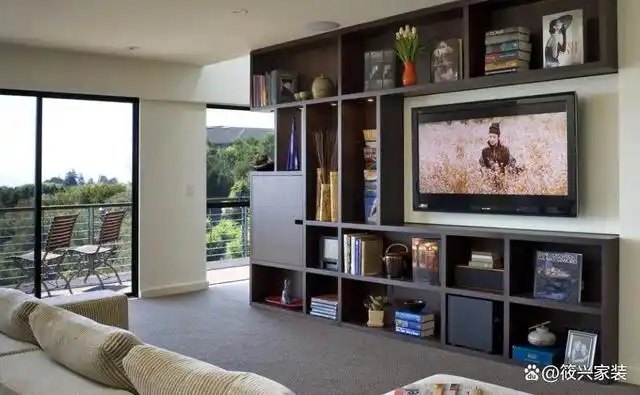 2,半开放式收纳背景墙这种书架兼储物柜的电视背景墙,满足开放式装饰